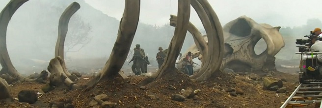 Alright . . . right now I’m going to tell you how freaking cool this set is. It’s called The Boneyard and it’s pretty self-explanatory in its name. At some point in the story, our heroes will come across a vast area with all sorts of bones buried. We’re talking dinosaur bones, human bones, and even bones that look eerily reminiscent to the 1930s Kong (an Easter Egg, of sorts). Imagine something like the elephant graveyard from THE LION KING, except embedded in between some Hawaiian mountains, and you’ve got the right idea. The really cool thing about this set is that it could have easily been built on a stage, in order for production to more easily manipulate/control the environment. The fact is that they actually build this thing in Hawaii and that just sells it. It will be digitally extended for the film, I’m sure, but standing there and seeing these MASSIVE bones just buried everywhere was a sight. As far as the scene being shot there, well, they wouldn’t give us many details. However, looking at some of the playback, it appeared very reminiscent of the scene from PREDATOR where the soldiers are just firing everything they have in a single direction. As to what they were shooting at . . . I’m afraid we’ll have to wait until next year to find out!