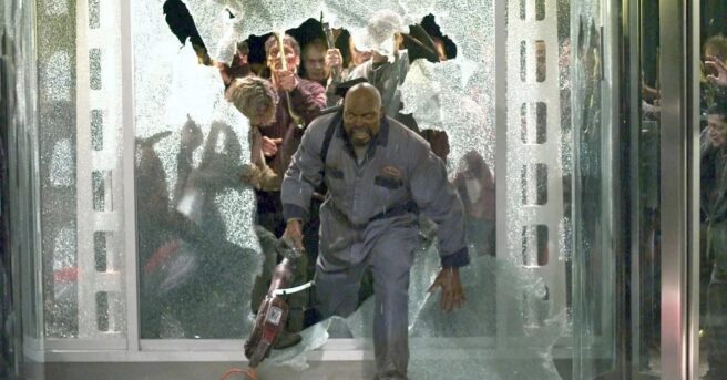 – An army of Zombies rush through the main hallway of the premises, taking down the human residents in the process. The highlight of that scene for me was seeing that poor sap get tackled by an undead to then crash into what looked like to me a “huge” flower pot. That Zombie should audition for the 49ers. What a tackle!
