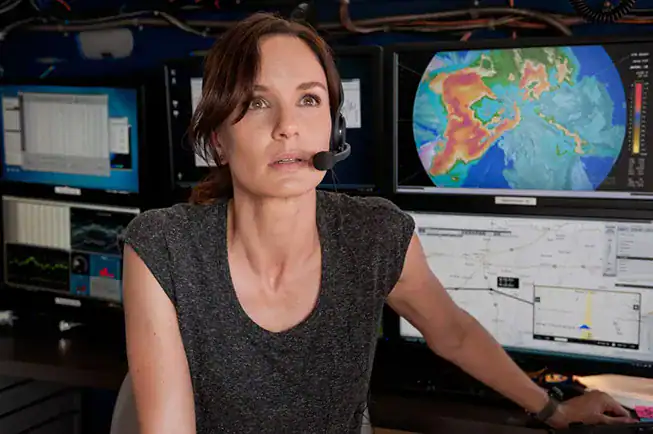 “She’s your source of exposition,” Callies says of Allison. “She’s a professor of climatology and meteorology so I got to look up 30 words I’d never seen before. She starts with a group of storm chasers and what’s kind of interesting is the question ‘Is she going to switch over from the storm people to the human people?’ I think that she’s the one whom we tell the story of the balance between science and people. Pete comes down on one side of that and Gary represents the other side and she kind of gets pulled between.”