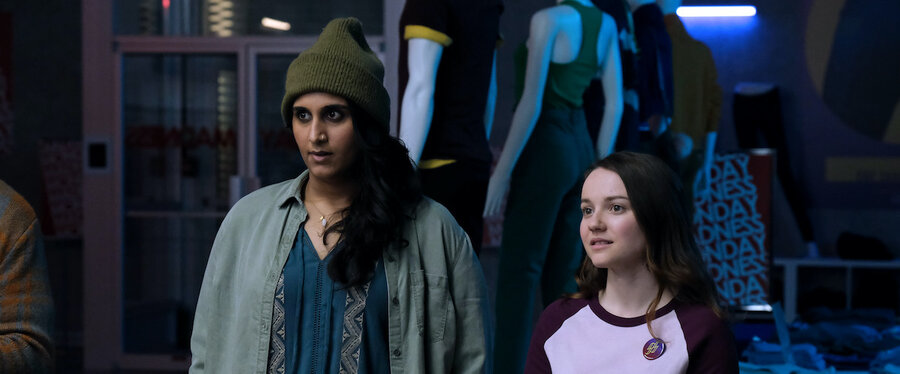 I can appreciate that Kephart matched the gore with the heightened world she created. The first kill shows off the buckets-of-blood style she is going for, and it had me cheering like a loud drunk on Saint Patrick’s Day. We get bodies chewed in half, hands cut off, and much more. More akin to the gore of Evil Dead 2, Slaxx knows its audience and knows it well. One avenue that is always a tough sell for me is comedy when mixed with horror. Not that I don’t love the classics or the contemporary hits, but I find it forced a lot of the time. Slaxx got more than a few chuckles out of me, and dammit if the coded and asinine retail talk didn’t have me pissing my pants at times. A stand-out scene has Libby awkwardly (though endearing) trying to connect with Shruti over music which goes as south as you’d expect it to nowadays. Bhojani has the dry cadence and delivery, making her probably my favorite character.
