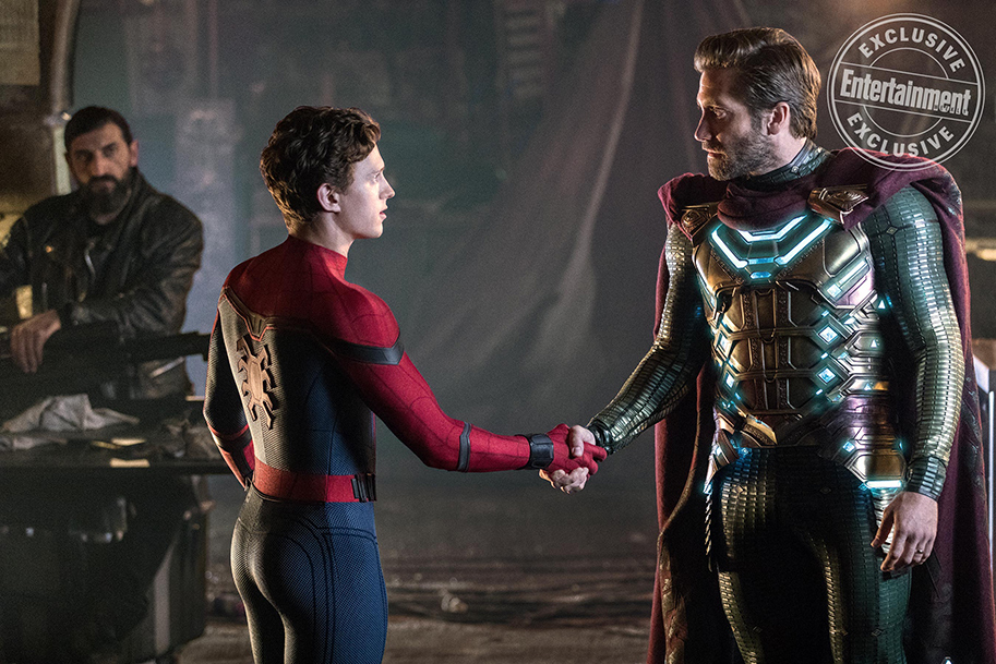 One of the biggest takeaways from the first trailer was the inclusion of Gyllenhaal’s Mysterio, donning a sweet costume fit with flowing cape and fishbowl helmet – which looks cooler than it sounds. The character is a notable villain in the Spidey universe, but in a new image, we can see the two characters shaking hands, hinting they will be working together for at least some time.