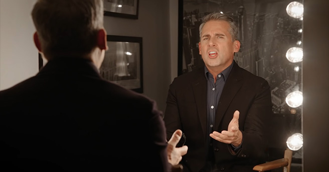 Carell confidently tells her not to worry, for he is an actor, and actors always prepare. What follows is the thespian intensely, vigorously preparing to take on the role. He takes tons of notes before tossing the papers off to the side and reads famous books about becoming funny again once you’ve gone serious. He also tests some accents, and some physical gags, all of which will help him step into the skin of the “funnyman.”