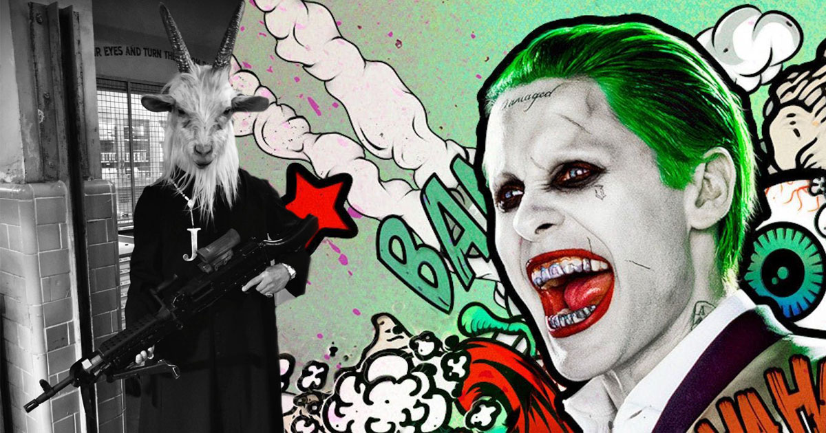 Recently, Ayer shared new Suicide Squad images (via Instagram) from the elusive “Ayer Cut” featuring Jared Leto’s Joker. The first image shows Joker in the “circle of knives” hotel room set, holding a gun beneath his chin. Surrounded by champagne bottles, we see Joker looking up in total bliss, the gun cocked and ready to fire.