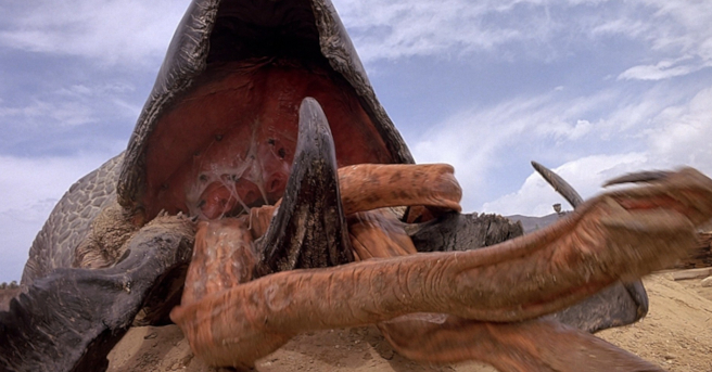 Trying to escape their dead-end life in the desert town of Perfection, Nevada, Valentine “Val” McKee and Earl Bassett find themselves sidetracked when corpses mysteriously start piling up around them. When Val and Earl have a run-in with some creepy tentacled... See more creatures that have made lunch out of a road crew, they retreat back to the town to spread the news. Although these monsters are not exactly intellectuals, their mental powers are still mind-boggling. Detecting a human hiding in a car, they dig under the vehicle, causing it to sink into the earth. Val and Earl get help from several townspeople. With the help of Rhonda, Val and Earl kill one of the monsters. But there are three of them left, and they are each about 30 feet long. Walter starts calling the monsters graboids. When the survivors think they have outwitted the graboids by taking refuge atop the roofs of buildings, the graboids merely destroy the buildings’ foundations, killing two people. The graboids are quick learners when it comes to stalking their prey, and the humans must continually be on their toes if they are to stay alive while they try to find a way to defeat the graboids.