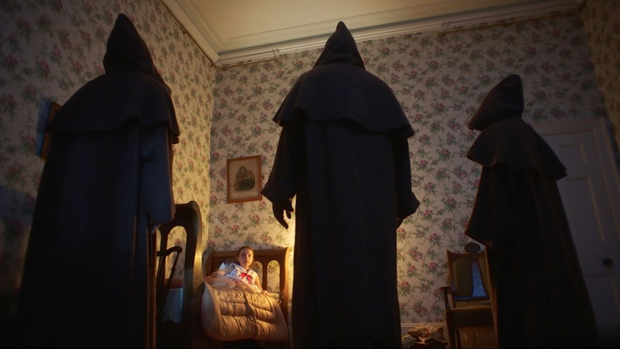 Linus (John Heffernan), along with his new wife Marianne (Jessica Brown Findlay) and stepdaughter Adelaide (Anya McKenna-Bruce), have been given a lottery ticket into a better life. In a time of economic failings, they have been given a chance to live like royalty, with no strings attached. Except that Marianne sees strange and violent events that haven’t actually happened while her daughter is talking with some invisible friends and playing with dolls that look like hooded cult members. Maybe there is a catch? Marianne is the first to notice the odd occurrences, and with a hidden backstory filled a bit of tragedy, she’s not quite sure how to navigate the clusterf*ck that is a haunted mansion while her God-fearing husband wants to hear none of it.