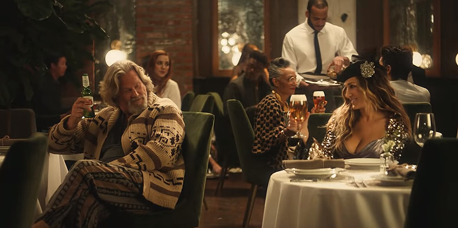 As it turns out, the full commercial is available to watch right now, courtesy of … Stella Artois? Yup. You heard me. It's a beer commercial. Oh, and did I forget to mention that Sarah Jessica Parker also stars in the ad? That's right, and she's reprising her Carrie Bradshaw character from HBO's SEX AND THE CITY. You know, because nothing makes you think of tipping back a cold one more than Jeffrey "The Dude" Lebowski and Carrie Bradshaw hob-knobbing in some upscale lounge. Shit, I hope the barkeep accepts inevitably bad checks.