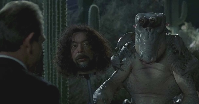Right off the bat however, we must concede what works so undeniably well with MIB. Its knowing sense of self-reflexivity. With tongue-in-cheek (on par with something like MARS ATTACKS) from the onset, MIB is very aware that it’s a silly, zany, over the top piece of pop entertainment that not only pokes fun at itself, but big budget blockbusters on the whole as well. The movie calls attention to its own absurdity, endearingly so. Yet, being in on the joke does not insulate it from being mostly unfunny. While there are no doubt a few laughs in MIB, while there are surely some colorful characters and impressively eye-popping visual gags in the film, it simply isn’t enough. In the end, MIB is akin to an extremely expensive TV dinner meant for the easy-access, spoon-fed microwave mentality. It’s big dumb fun entertainment, sure. It goes down easily, excreted even faster!