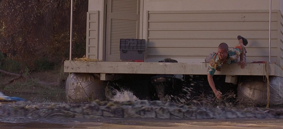 What I like about this setup is how we instantly identify more with the Crocodile’s plight than that of the obnoxious teens. When the group stumbles on a nest of Croc eggs, they not only show little regard for the endangered species, but at one point Hubs steals one of the eggs and places it inside Claire’s bag, unbeknownst to her. Therefore, Flat Dog isn’t killing the kids out of necessity to eat, but rather to avenge their thievery and get her baby croc back. As ridiculous as the movie is and this is to say, one can actually view this flick as advocating for environmentalism. Hooper did similar with animal rights and gas prices in TEXAS CHAINSAW MASSACRE, so it’s not out of the realm to view the film in this light. Still, any social commentary is almost impossible to stick in such a laughably awful but frankly damn entertaining B-movie. Anyway, as Flat Dog proceeds to gorily hunt each deserving teen, one by one, leaving a grisly wake of entrails in its path, the survivors’ only hope seems to lie with Sheriff Bowman (Harrison Young) and, other than Duncan, my favorite character in Shurkin (Terrence Evans, who would go on to play Monty in the 2003 and 2006 TCM remakes), a crusty old wannabe Crocodile Dundee who know the lay of the land and the mythic lore of Flat Dog’s ancestry. I love how Shurkin’s cabin is intentionally decorated as a not-so-subtle nod Leatherface’s original abode, what with the moldering mise-en-scene, caged animals and unidentifiably jarred contents.