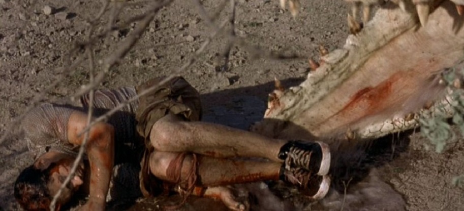 For a cheaply made creature-feature, one of the standouts of CROCODILE is how much onscreen footage is dedicated to the Croc, as well as its double-digit attack sequences. Normally, a chintzy movie like this will wait and show its creature sparingly to mount suspense. Not here. Hooper cares not about such matters, he’s more interested in delivering the gory goods as much and as often as he can. The result is no less than 10 brutal and bloody onscreen attacks. However, the way Hooper mounts the tension and suspense is by mixing non-lethal onslaughts with the gnarly fatalities. That is, not every attack ends in death, which is a smart way of not only keeping things from being monotonous, but also keeps us guessing as to who will really perish. Duncan gets attacked but narrowly survives. Same goes for Annabelle and her dog, Princess, early on in the film. In fact, Hooper is clearly having a tremendous amount of fun by toying with audience expectations as they relate to Princess. Much like in the movie MEG, we expect the cute little dog to become feasted on as an appetizer at some point in the film. Hooper hilariously runs this gag into the ground, but it’s still fun to find out whether or not Princess will live or die in the end. It gets to the point where you’d actually rather see the dog survive rather than the humans, just as we root for the Croc to get its rightful revenge.