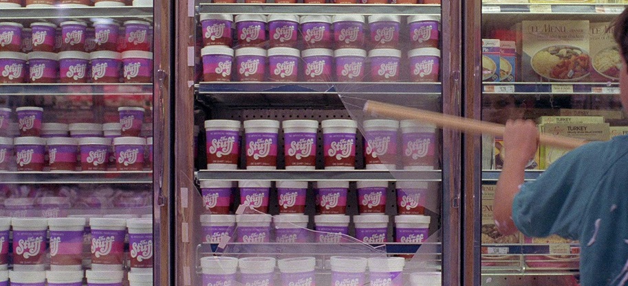 While the satire certainly sells, the fun of the movie it’s all about the cheesy, unashamedly low-tech VFX and wildly over-the-top death sequences. Word is Cohen was so upset by the chintzy look of the FX, that he only paid the company, Effects Associated, half of what was agreed on upfront (Cohen paid just $8,000 or so for the FX, and it shows), resulting in a class-action lawsuit against him. And yet, oddly, the tenor of the film is matched by its silly FX work. One of the standout stints in this regard is the gnarly motel room scene, in which The Stuff attacks Mo’s face, attaching itself like a giant Play-Doh face-hugger. In order for The Stuff to properly leak out of the pillows and climb up the walls, a room that could be flipped upside was needed. Get this, Cohen used the same room Wes Craven did to suck Johnny Depp through a gory waterbed in A NIGHTMARE ON ELM STREET, just one year earlier. That’s a piece of kickass horror trivia right there. So too are the hard to spot cameos of a young Mira Sorvino as a factory worker, Patrick Dempsey as a black-market street punk, and my favorite, Eric Bogosian as mop-boy in a supermarket???