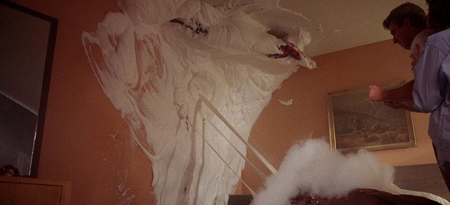 As for the Stuff itself, much of it was achieved using foam made from blended fish bones. Cohen reportedly said the substance reeked so badly that the actors covered in it would rush to the river to wash themselves off after he called cut. Fire extinguishing foam was also used in certain scenes, as well as animation and superimposition in the lake of Stuff found in the quarry. Without a doubt, the lake is the worst and most outmoded piece of VFX in the film. Fortunately, by the time we see it, we’re already in the bag for the movie as a whole, particularly for just how unapologetically ludicrous it is. The lake just adds one more chuckle. So too does the near-finale when Mo and Jason infiltrate the head of The Stuff company, and physically force-feed them as much Stuff as humanly possible – especially after the unveil their new product plan for The Taste, a similar substance with only 12% of The Stuff inside, just enough to crave but not enough o be driven mad. The grand takeaway being: “Are you eating the Stuff, or is The Stuff eating you?!”