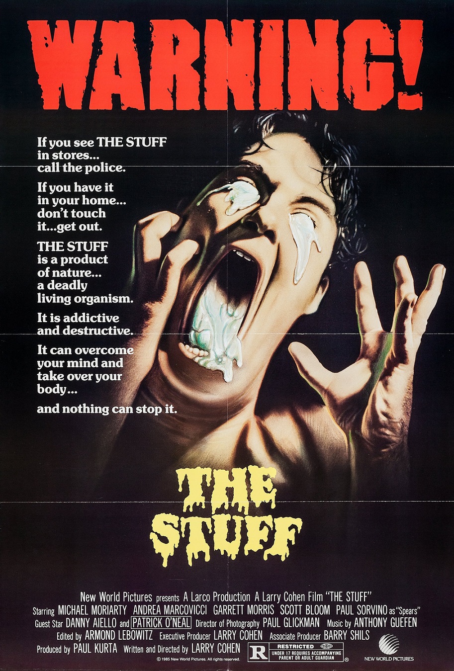 Speaking of King Cohen's filmography, what’s the first title or two that instantly leaps to mind when you hear the name Larry Cohen? It has to be either IT’S ALIVE or maybe Q: THE WINGED SERPENT, right? Hell, maybe it’s a Blaxploitation flick or two. If that’s the case, then damn near the rest of Cohen’s directorial canon can be considered a F*cking Black Sheep. Remember, he only produced/directed 20 films, but wrote nearly fourfold that amount. It's easy for his scripts for the MANIAC COP series, BEST SELLER, PHONE BOOTH and myriad others to overshadow the movies he actually helmed as well. Anyway, if I were to personally single out a movie that fits the bill as both a cast-aside runt as well as a movie that perfectly personifies the kind of outright absurdist fun Cohen was capable of, then no doubt, THE STUFF is where it’s at. Damn I love this unabashed 80s gross-out B-movie trashcan!