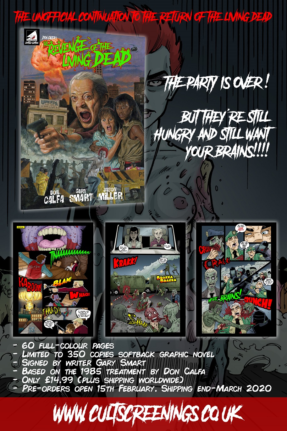 Fittingly dubbed THE REVENGE OF THE LIVING DEAD, the new full-color 60-page graphic novel is being billed as “the unofficial continuation” of O'Bannon's classic and is based on a 1985 treatment by late THE RETURN OF THE LIVING DEAD actor Don Calfa. It is limited to 350 copies.
