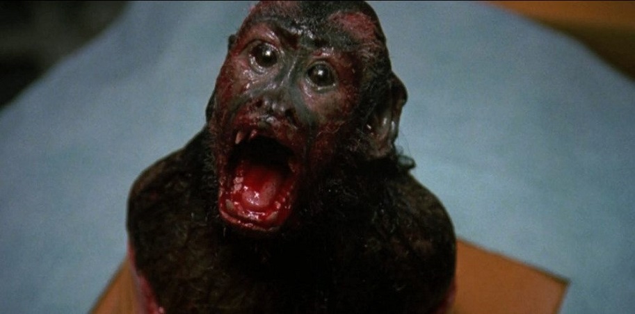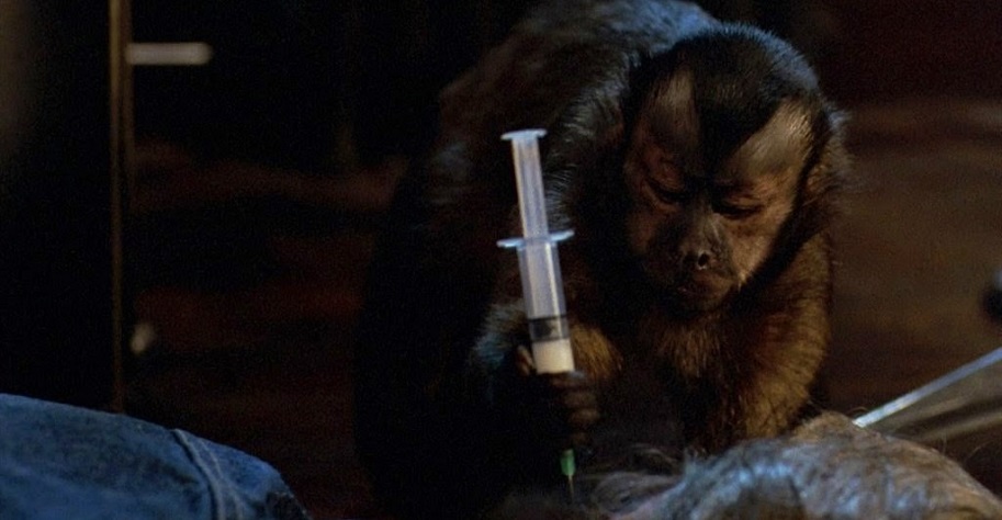 THE STORY: Adapted by Romero himself from the Michael Stewart novel of the same name, the story, which plays so straightforward and matter of fact, works so well because of the way in which the drama is approached first and foremost, allowing the horror to intrinsically unfold in tertiary fashion. A strapping athlete named Allan Man (Jason Beghe), a paragon of physical health, has his life completely upended when hit by a truck while jogging one day. Immediately paralyzed from the neck down, Allan is forced to live the life of a quadriplegic, confined to a wheelchair, dependent on technological gadgets and human household aides like nurse Maryanne (Christine Forrest) and therapist/girlfriend Melanie (Kate McNeil). When Mel suggests enlisting the help of a Capuchin monkey as a medical aide, Allan’s meth-addled chemist pal Geoff (John Pankow) – who has been conducting experiments on primates by injecting them with live human tissue – decides to bring the Capuchin monkey over to Allan’s house. Thing is, Geoff never tells anyone other than the sadistic Dr. Burbage (the great Stephen Root in his big-screen debut) about his experiments. No biggie, what could go wrong with spiking a primate with human DNA?