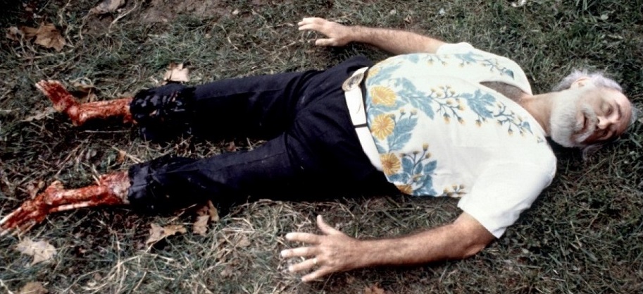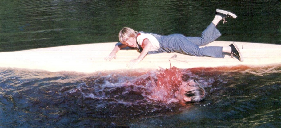 There are three deaths in particular that not only feature the aforesaid grue-geyser, but also showcase the impressive special effects work of fresh-faced Rob Bottin. The great Rick Baker was originally tapped to do the makeup and FX, but he in turn recommended Bottin for the job, who would go on to become one of the preeminent FX man in the horror realm. The first death is both startling to peer at as well as heartbreaking to think about. Although ancillary characters dubbed as Boy in Canoe (Jack Pauleson) and Father in Canoe (Eric Henshaw), when Paul and Maggie find a kid stranded on a tipped-over canoe, they reach out to help. The boy’s father is not only gorily masticated right in front of him – with a well of blood bubbling up like lava – when his saviors show up, they immediately toss the father as a sacrificial snack to the uncouth fish as the poor kid cries out for his father. It’s just as much a jolt to the heart as it is to the eye!