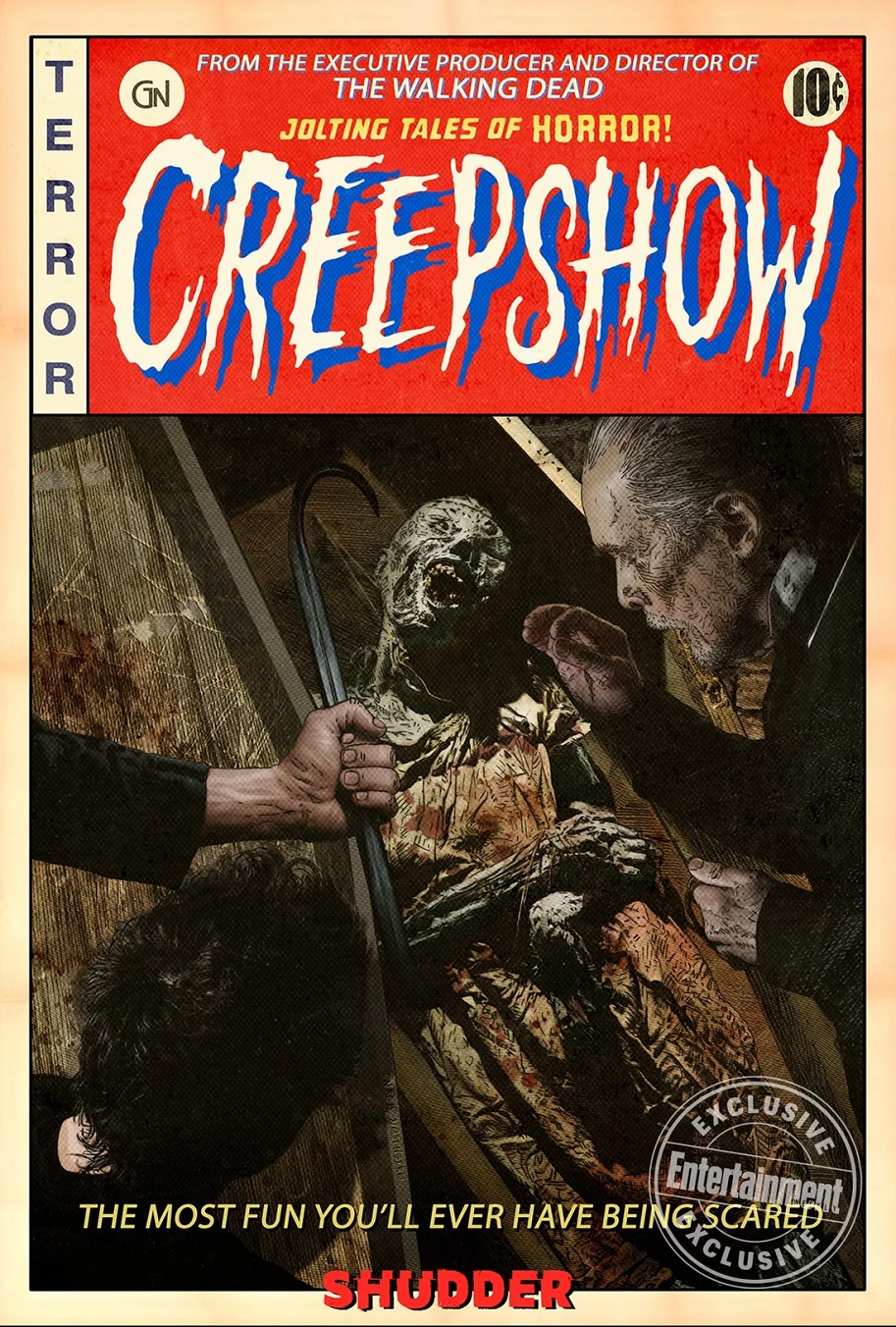 The poster art Tim Bradstreet has created for Shudder's upcoming Creepshow TV series doesn't have that awesome Creep element, but it does call back to the classic EC horror comics that inspired Romero and King to make CREEPSHOW. Bradstreet's poster can be seen below.