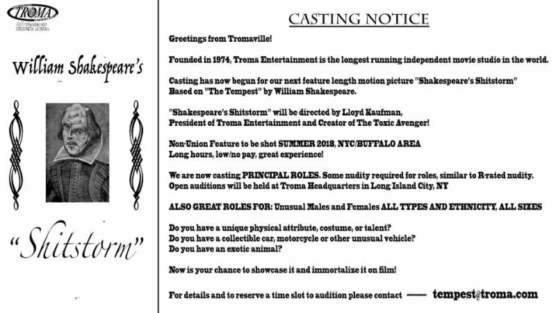 This could quite possibly be my last movie, and to some, my first movie! Michael Herz, The Troma Team, and I are extremely excited to officially open the cast and crew call for 'Shakespeare's Shitstorm'! This movie, being a spiritual sequel to 'Tromeo & Juliet', will be Troma's second take on the Bard. Contact tempest@troma.com if you'd like to be in and/or work on 'Shakespeare's Shitstorm'!"