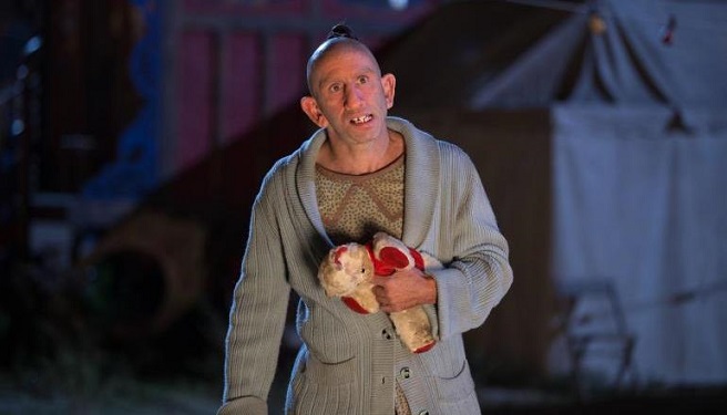 THE SKINNY: It’s hard to follow up last week’s refreshingly gruesome Blood Bath, but hey, after dumping some dead weight, why not celebrate with a motherf*cking Tupperware Party Massacre?! Makes perfect sense, right? That’s indeed what we did with the ninth frame of Freakshow, which I thought did a pretty good job of giving us more of what has worked well this season, and less of what hasn’t. And it pretty much all started with that chilling pre-credits double showdown with Dandy, first with Maggie, then with Jimmy. Absolutely loved that scene of Dandy decapitating his mother’s visiting friend, only to attach her disembodied head to his own mothers, creating a human Siamese-twin marionette he affectionately refers to as Dot and Bette. Sick shit! Then, when Jimmy, sozzled to the gills, actually calls Dandy out for being the crazy-killer-clown #2, Dandy threatens old flipper-fist something fierce. Something’s gotta give, right!