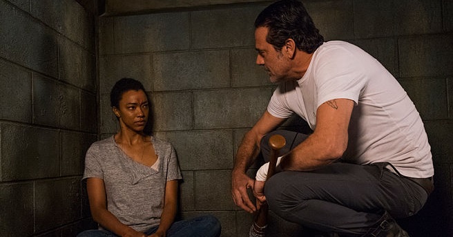 While the "we need to pay off this storyline and take these steps" part of the episode played out at Oceanside, the previous episode's cliffhanger involving Sasha (Sonequa Martin-Green) entering the Saviors' home base the Sanctuary was also followed up on. The scenario could have provided some action and thrills, but instead it's presented in the most sedate way possible. Did you think maybe Sasha might be stalking the halls of the Sanctuary, taking down Saviors as she went, leading to some kind of violent confrontation with Negan? Don't get carried away imagining the possibilities, because she's already locked up in a cell by the time the episode begins. And in a cell she sits for the duration of the episode – having some dramatic interactions with Eugene (Josh McDermitt) and Negan along the way. Eugene proves himself to be exactly the cowardly scumbag I suspected him of being, while Negan almost comes off as being something of a good guy… if only we didn't know him as the guy who murdered Abraham and Glenn and a few more people since. Those season premiere kills are tough to get past, and we can't be lured over to Negan's side right when we're about to get the fight against him we've been waiting for all season.