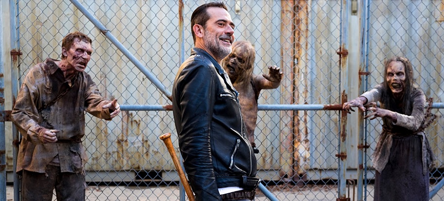 GORY GLORY: Negan coating his barbed wire-wrapped bat Lucille in zombie blood was a nicely done effect, especially when he digs the wire into the dead man’s cheek.