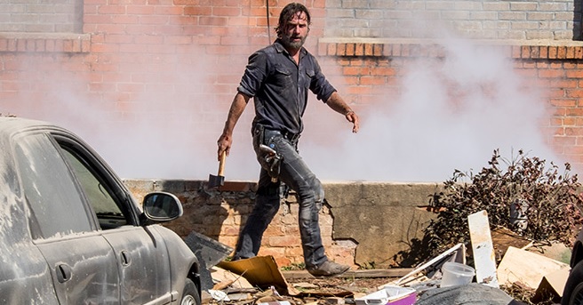 What we got instead was an extended confrontation between Rick and Negan that starts with a car chase. And even though The Walking Dead is the most popular show on television, this episode did not have the budget to pull off a cool car chase through empty city streets, even skipping over a chase-ending stunt and just cutting to an unconscious Negan waking up in his overturned car. Thankfully, the Rick vs. Negan portion of the episode continues beyond that point, with Rick chasing his adversary into an abandoned building while demonstrating what The Talking Dead host Chris Hardwick described as "stormtrooper aim". I hope Rick was purposely missing Negan with all those shots he fired at him, because it would be pretty pathetic if a former police officer living in a zombie-infested post-apocalyptic wasteland had aim that terrible.