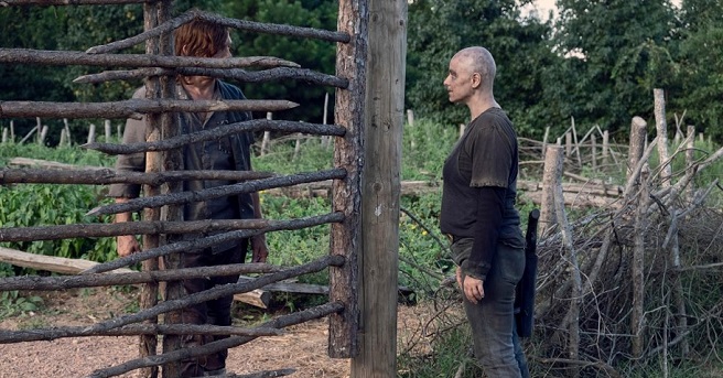 The Hilltop has Alpha's daughter Lydia (Cassady McClincy) in their custody, the Whisperers have Hilltop residents Alden (Callan McAuliffe) and Luke (Dan Fogler). Although Alpha takes a very cold approach to her people, even ordering one female Whisperer to abandon her baby in a field as zombies approach because the infant is making too much noise, something within her has made her break her own code of conduct and go after her daughter, offering a trade of captives. Daryl isn't very receptive to this trade offer, since he knows Alpha beats Lydia, much like his own father used to beat him. That's a great set-up for emotional interactions between these characters, but they're still holding back in Bounty.