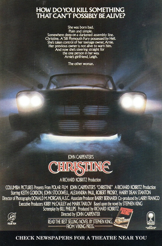 Unpopular nerd Arnie Cunningham (Keith Gordon) buys a 1958 Plymouth Fury, which he names Christine. Arnie develops an unhealthy obsession with the car, to the alarm of his jock friend, Dennis Guilder (John Stockwell). After bully Buddy Repperton (William Ostrander) defaces Christine, the auto restores itself to perfect condition and begins killing off Buddy and his friends. Determined to stop the deaths, Dennis and Arnie's girlfriend, Leigh Cabot (Alexandra Paul), decide to destroy Christine.