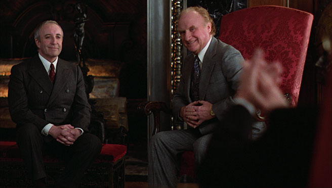 There's a fairly standard rule in screenwriting that says the main character absolutely must be the one who drives the plot forward- a rule which BEING THERE ignores with a fury. In some ways, it's the deliberate refusal to follow this rule that makes the story so compelling. Instead of a cool hero or a flawed but noble protagonist, we basically have a blank slate upon which the audience and the other characters can project whatever they want to see. That isn't enough to carry a film though, and so we also have in Chance a childlike, television-obsessed innocence juxtaposed with fine suits, polite behavior, and an overall distinguished look. These dynamics go a long way to us believing the other characters can see him as an eccentric instead of an idiot… because let's be clear, he is absolutely an idiot. In Eve and Benjamin Rand, we have a different kind of innocence, with the pair wanting someone to look after Eve and carry on Ben's legacy and both hoping "Chauncey Gardiner" is just the man for the job. Finally, we have the President of the United States, who while less enthralled with Chance than the others, is still fooled by their short meeting, at least enough to set forth the ensuing political antics and lose his libido in the process.