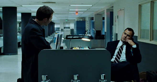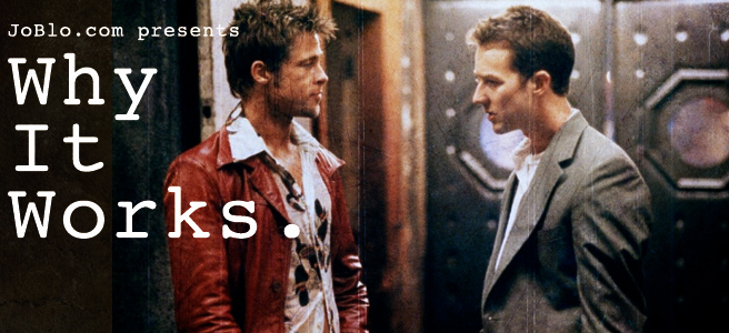 Like a perverse version of THE WIZARD OF OZ, FIGHT CLUB sees a bored, frustrated protagonist thrust into a new and exciting world. We're never told his name, because we already know him. He is the quintessential everyman. The narrator suffers from insomnia and speaks about his job and his IKEA-furnished condo in a monotone, overtired voiceover. He's not cool or exciting, but we see ourselves in him and can't help but put ourselves in his corner.