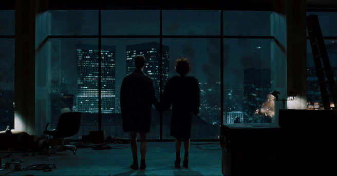 Going back to the WIZARD OF OZ comparison, FIGHT CLUB, much like the 1939 classic, eventually reveals the main character's own imagination as the impetus for the entire plot. For a movie whose climax involves an entire financial district being razed to the ground, the real resolution of the story lies in the narrator's triumph over himself. By killing Tyler, the narrator finally merges his frustrated consumerist self with his ideal dream self. It's a happy ending with a slain villain and an evolved hero, the latter standing hand in hand with his princess while, around them, the world burns (and splice in a single frame of male genitalia for good measure).