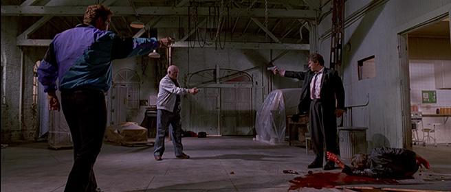 It's only an hour into the film that Mr. Orange kills the maniacal Mr. Blonde and admits to being a cop to the grateful Officer Nash. Just as we're left having no idea how he'll get out of the situation, Tarantino takes us on a 25 minute field trip to tell us the backstory of Detective Freddy "Mr. Orange" Newandyke, keeping us on the edge of our seats until we finally get back to the warehouse. In the film's final moments, we're treated to a Shakespearean standoff where Joe, convinced Mr. Orange is a rat, points a gun at him, Mr. White, convinced Orange is clean, aims his piece at Joe, and Eddie, none too pleased about his father's life being threatened, levels his weapon at Mr. White. Meanwhile, Mr. Pink finds himself a nice hidey-hole. Shots are fired, White takes a second shot at Eddie, and cleanup on aisle 5.
