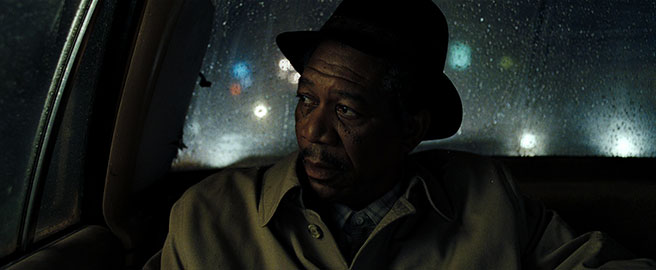 Perhaps one of the most interesting devices in storytelling is the inclusion of two diametrically opposed leads. We find ourselves identifying with one, the other, both, or neither depending on the scene. It also allows for some fascinating dialogue, in which the story's themes are discussed rather than preached. In David Mills, we have the sarcastic husband who keeps his ties pre-knotted partnered up with William Somerset, the erudite loner who lines his accessories on the dresser at night and carefully lays out his suit. While the characters come off as polar opposites at times, their shared goal to catch a killer overshadows much of the discord. Moreover, each character helps combat the bleak nature of the film in his own way. Somerset's refined, distinguished nature brings a level of class to the film (as does Morgan Freeman himself), while Brad Pitt's smart-assed, impatient Mills allows for moments of levity and immediacy and gives the average viewer a "regular guy" to latch onto. Similarly, in just a few scenes, Gwyneth Paltrow's Tracy shines a white light through the filth of the story, representing hope and purity in an otherwise depraved world.