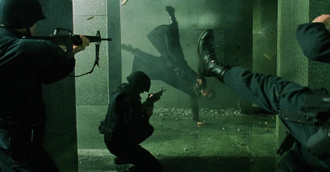 If there’s one thing Hollywood will probably always be guilty of, it’s the constant copycat mentality. Movie A stuns audiences, so movies B, C, D, E, and F are made the following year in an attempt to be as similar to movie A as possible, when what really made movie A so effective was the fact that it was unlike anything else we’ve ever seen. Cue THE MATRIX. A short 16 years later, plenty of the concepts and visuals of the film seem fairly commonplace now that countless movies, TV shows, and video games have borrowed and sometimes improved upon so many of these techniques. The tricky thing here is that a thirteen year old kid watching THE MATRIX today may not know any of this, so coming first can’t be what gives a movie its staying power. What sets THE MATRIX aside from most of its progeny is the addition of philosophy, style, and humor to the action-rich plot. In the midst of keeping us on the edge of our sets, the Wachowskis have us questioning reality, shopping for long coats and thin sunglasses, telling everyone we meet that we know kung fu, and trying to replicate a certain “cool factor” that can’t be calculated by a team of Hollywood executives.