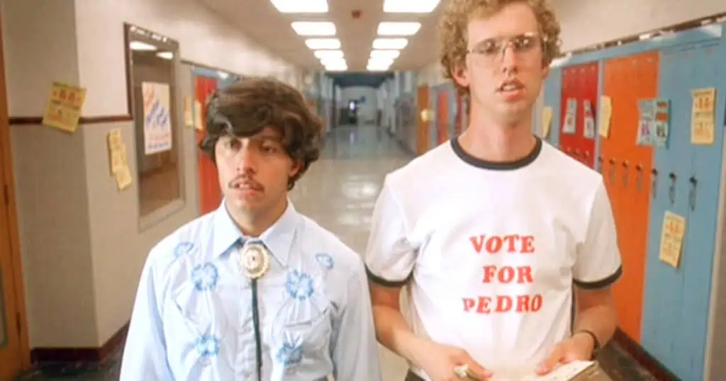 As for Pedro, played indelibly by Efren Ramirez, it’s worth noting that he was 31 years old at the time of portraying a high school student, while Heder was 26 at the time he portrayed the 16-year-old Napoleon. Interestingly enough, both Heder and Ramirez have twin brothers in real life. Stranger yet, the character of Napoleon’s older brother Kip, played by Aaron Ruell, is supposedly 16 years older than Napoleon in the movie but Ruell is only one year older than Heder in real life. Yet, thanks to the performances, all the characters are totally convincing.